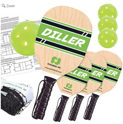 Includes a durable tie-on net (22’L), 4 Diller paddles, 4 pickleballs and a rules/strategy sheet